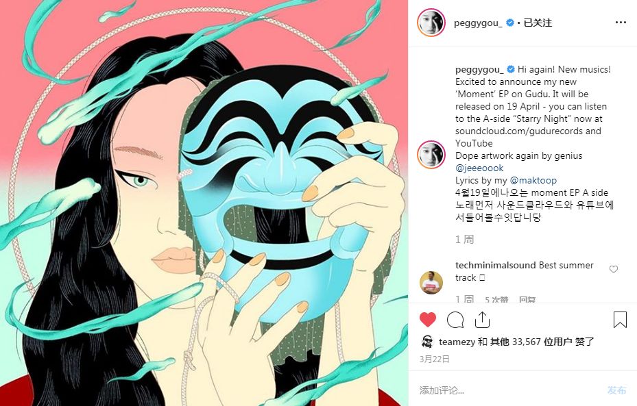 除了媒体说明了这一切以外,Gudu Records的官方账号也清晰地写明了一大重点——“Record Label from Peggy Gou”。粉丝转化率也算非常高了。有消息称《Moment EP》总共包含两首作品,除了已经发布的《Starry Night》作为A面以外,又有《Han Pan》作为B面。