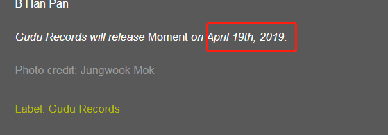 据悉,这张新EP上仍然会加入她亲自演唱的韩语、英语的人声。或许依然是真正的House Music的路数,所以与EDM House在配器上大有不同。这张EP名为《Moment》,其中《Starry Night》现已发行。艺术设计师Jee-ook Choi将负责Gudu Records未来的封面设计。