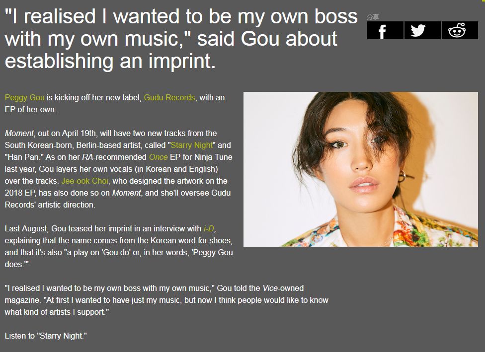 比如说RA,他们公布了许多关于这件事的秘密。Peggy Gou告诉RA的杂志负责人,“她希望通过自己的音乐,成为自己的老板”。“起初她只是想着拥有自己的作品,但现在她将通过厂牌的方式对她喜欢那种艺人进行支持”。从制作人升级为厂牌老板。