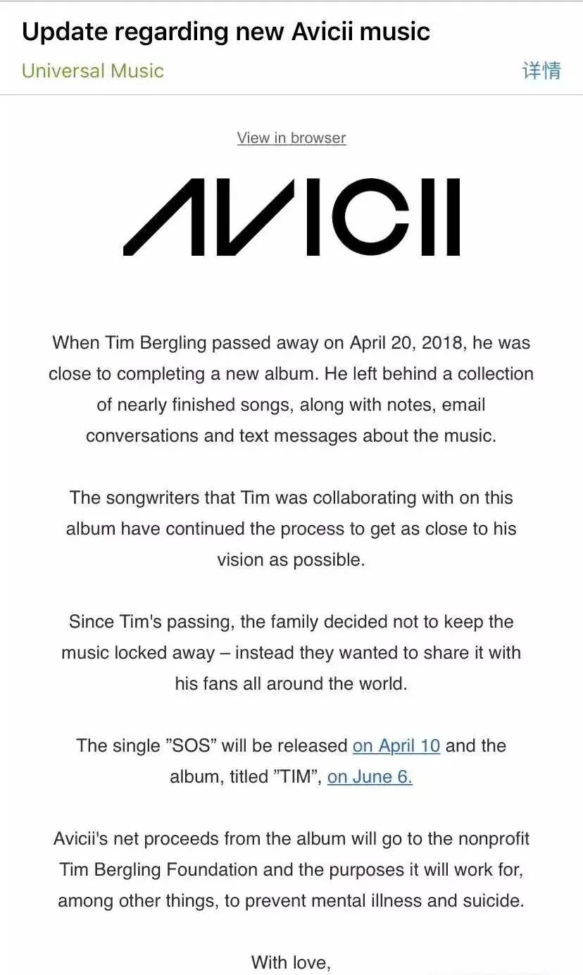 但好消息来了,这是近一年来最官方、最有真凭实据、最能称之为实锤的说法。三大Major Label之一环球音乐,通过邮箱、媒体合作等方式,宣告Avicii离世前未发行作品的发行计划。包含我们在内的许多媒体、粉丝于第一时间得到了官方消息。他的作品将随着一张名为《Tim》的专辑收尾。