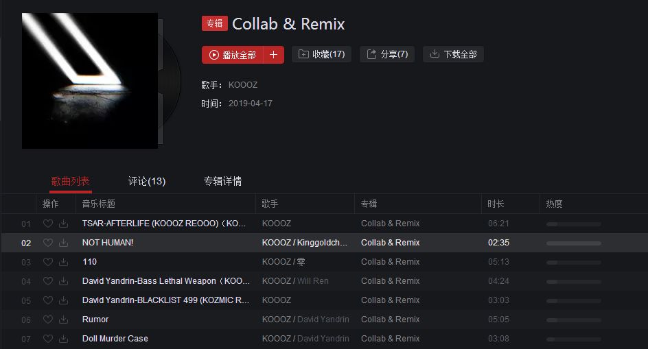 此外,KOOOZ又发布了另一个整理形式的合集《Collab & Remix》,收录了七首KOOOZ曾经与他人合作或受邀为他人音乐推出的Remix作品。这七首音乐可能并没有被KOOOZ下架,但从未于KOOOZ页面推送。合集的意义,便是为了补齐它们的推送,直截了当,大大方方。