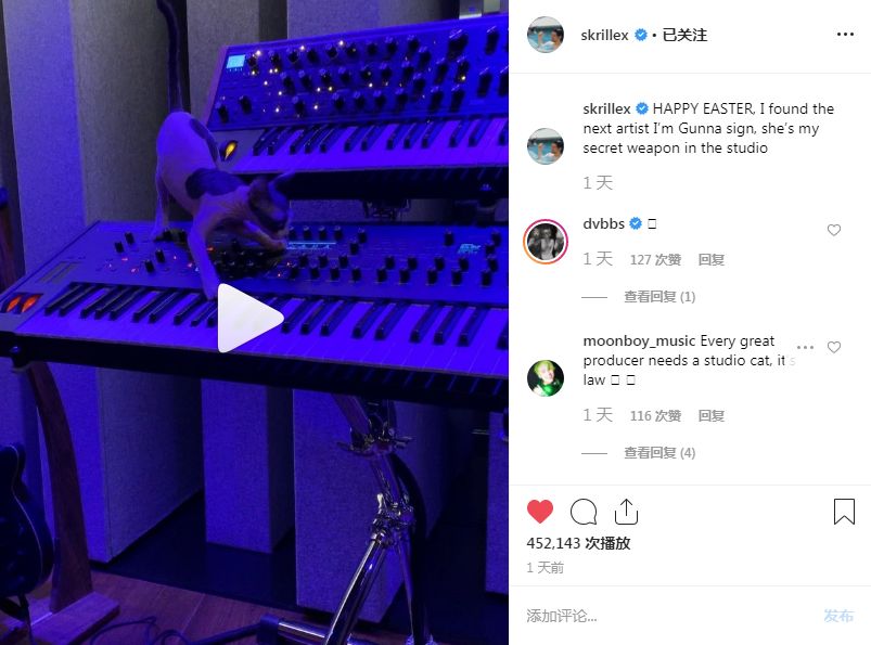 事出有因。就在昨天,Skrillex又一次传达了他的美式幽默。他向国际社交媒体平台上的上千万粉丝,公布了他即将签约的“下一位艺人”,以及他的工作室“帮手”,甚至拍摄了这名“帮手”帮助Skrillex演奏电子乐器的过程,听起来有几分实验性。