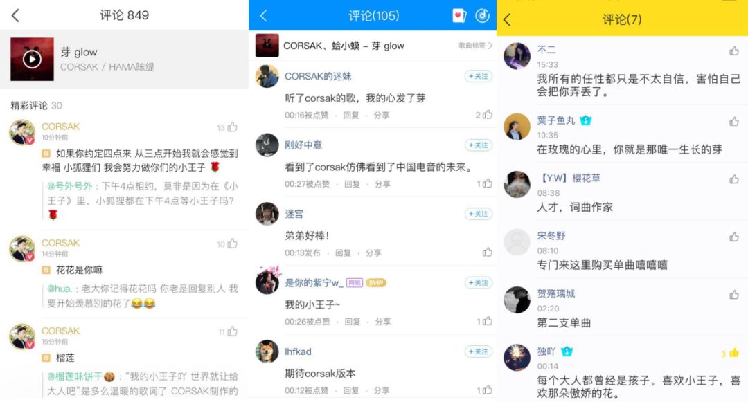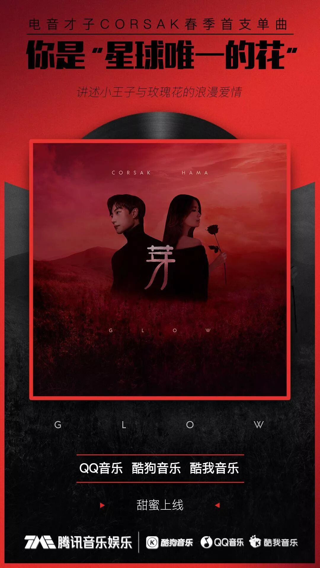 CORSAK说过,他喜欢用音乐传达故事。《芽 glow》的歌曲灵感来源于法国著名小说《小王子》,用全新的作词以及故事化、清晰化的编曲渲染,重现玫瑰花对小王子的迷恋与爱慕之情。在腾讯音乐娱乐集团三大平台上单曲《芽 glow》的评论区里,可以感受到粉丝们对这首新歌的喜爱,而CORSAK更是惊喜空降到评论区与粉丝在平台上多次互动。