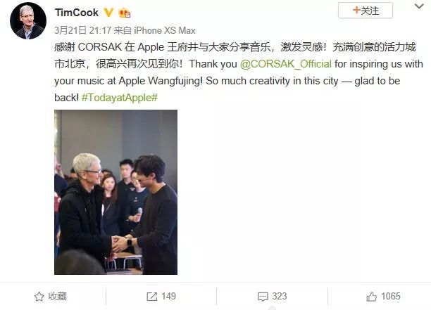 今年3月31日,库克与CORSAK共同现身北京苹果王府井直营店分享音乐,活动上,CORSAK通过Logic Pro X专业音频应用进行了现场音乐创作,令库克十分满意,事后,库克发布微博表示:“感谢CORSAK与大家分享音乐、激发灵感!”