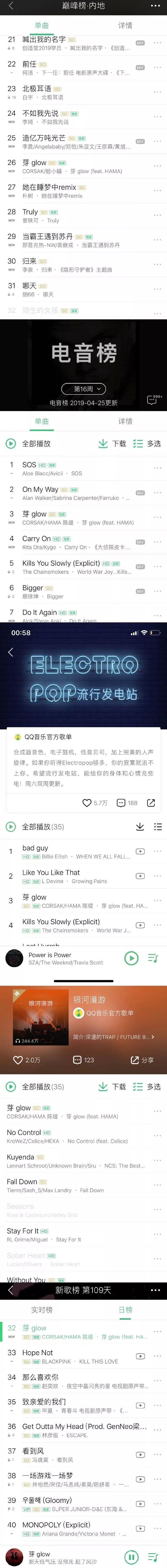 截止自目前,《芽 glow》已经荣登腾讯音乐娱乐集团旗下QQ音乐、酷狗音乐、酷我音乐三大平台的“巅峰榜”、“新歌榜”、“电音榜”、官方Electropop歌单、官方Trap/Future Bass歌单,最高拿到了第三的好成绩。