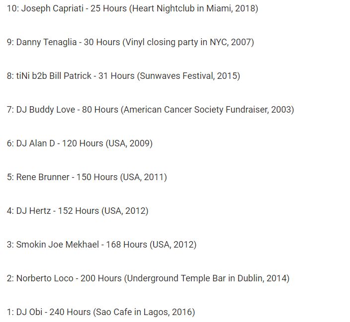 根据吉尼斯世界纪录表示,目前为止地球人创下的打碟马拉松最高时长记录为DJ Obi的240小时的演出。此前Joseph Capriati位居全球第十名,突破了个人记录以后,仍然排名第十。不过,突破自己才是最大的突破,毕竟Joseph Capriati已经实现了一件听起来几乎不可能的事。