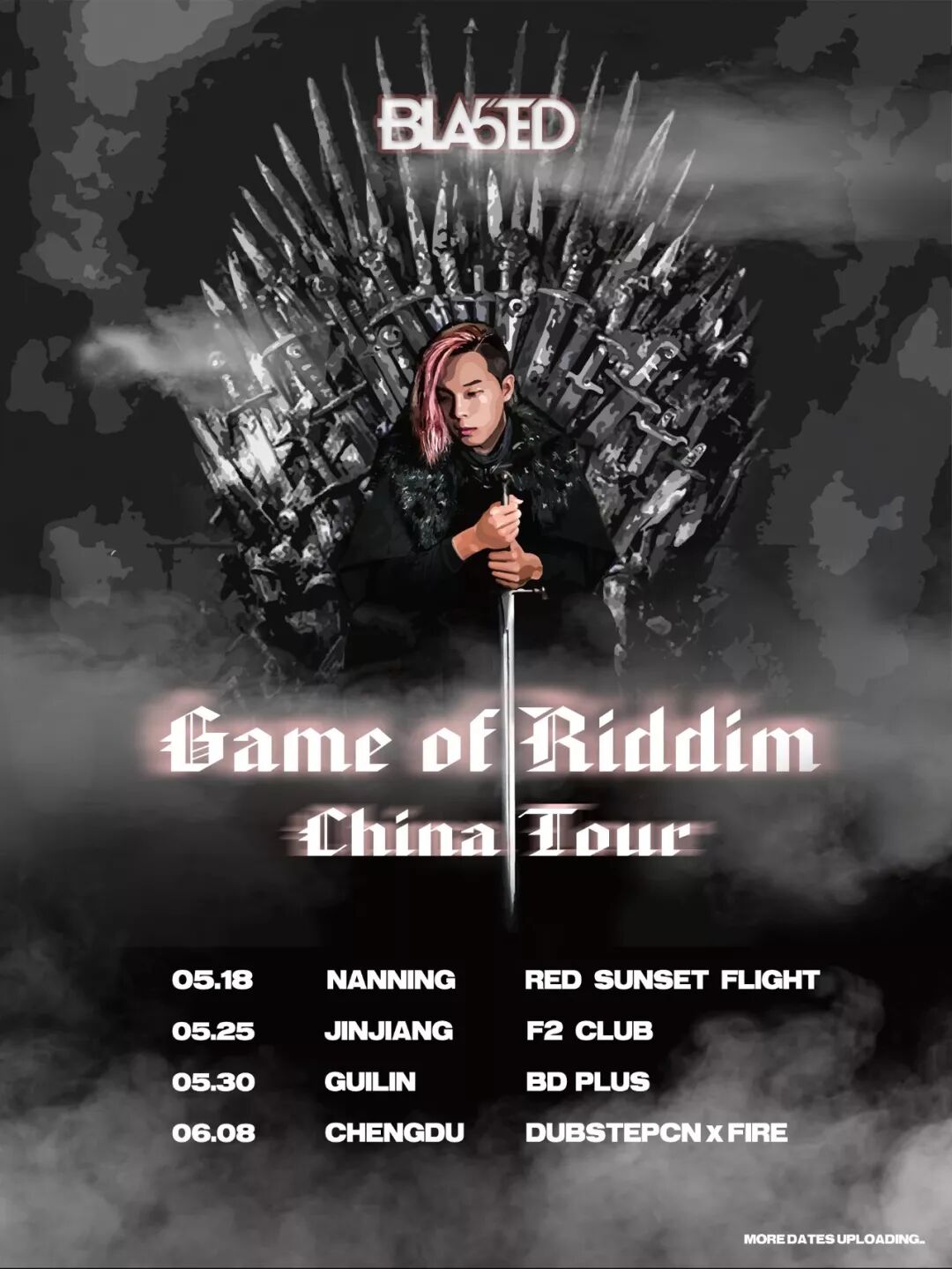 《Game Of Riddim EP》发布之余,Bla5ted紧锣密鼓地开始安排着EP China Tour,现已确认会在南宁、晋江、桂林、成都演出。我们看见了Bla5ted不断提升的黄金发展期,将继续期待他输出更多优质的Orchestral Riddim/Riddim Dubstep作品。在网易云音乐搜索“Game Of Riddim EP”或点击阅读原文,试听该EP完整的三首新单曲。