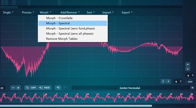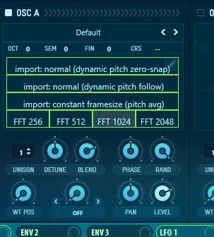 ① 试着将Sample变为波表。Serum的波表功能非常强大,其提供了多种读取模式,可慎重选择后做出大量细微调整,不过不要奢求Serum能够像Harmor那样精准地还原Sample,Serum反倒是可以提供很多创新的可能。
