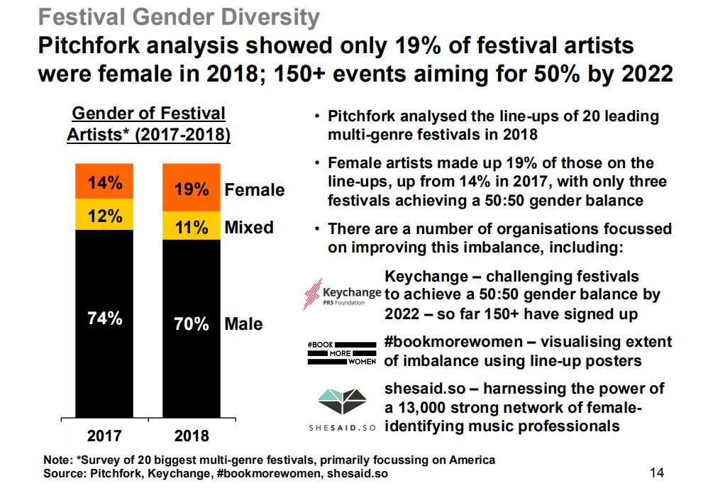 数据六:音乐节阵容中男女比例失调的问题正在得到解决,根据数据推断和论证,到2022年,女性表演者将达到音乐节阵容中的50%。该数据在此间接地论证这将是女DJ/制作人最好的发展时期。