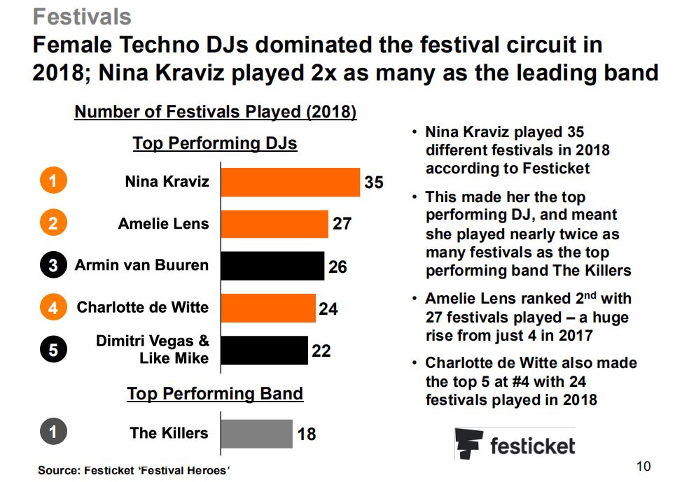数据二:在音乐节上,演出场次最多的前五名DJ,有三位是Techno女艺人!前五位音乐节表演者的顺序分别为Nina Kraviz→Amelie Lens→Armin van Buuren→Charlotte de Witte→Dimitri Vegas & Like Mike。注意,该排名仅限音乐节而不是夜店,Techno笑傲江湖,女DJ/制作人成为现场控制者。