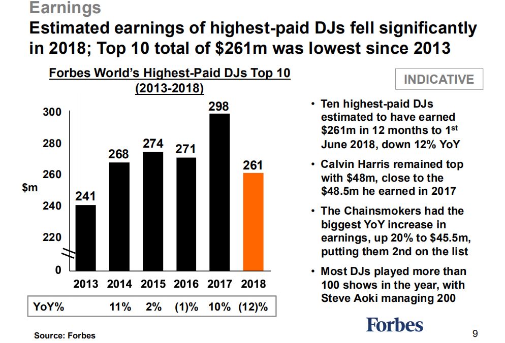 数据一:福布斯收入Top 10 DJ们在2018年的收入明显下降,甚至低于2014年的水准。介于福布斯收入前十名的DJ都是EDM DJ,从此现象中我们也可以看出EDM艺人们不再那么受主办方喜爱。举个例子,很多EDM音乐节更多地开始请Bass和Trap艺人了。