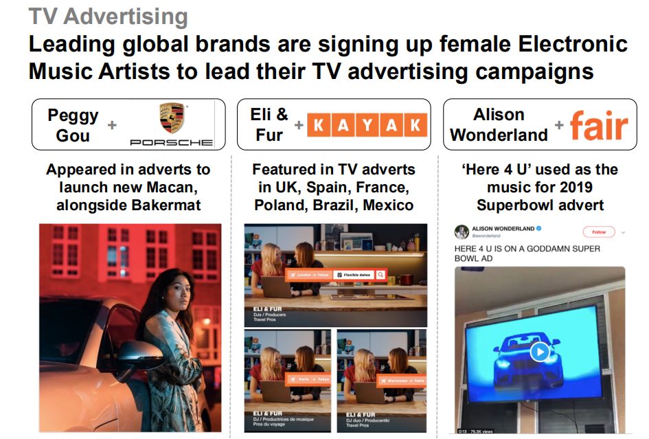 数据五:音乐艺人们正在为电视广告、全球名牌代言。Pop Music们统治广告圈的时代已经过去了,接下来为这些大品牌代言的明星们极可能是女性DJ/制作人们。