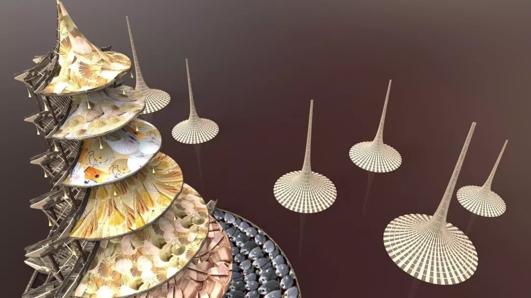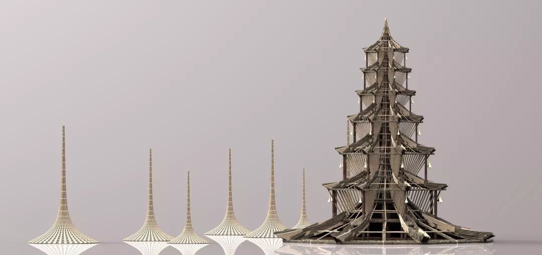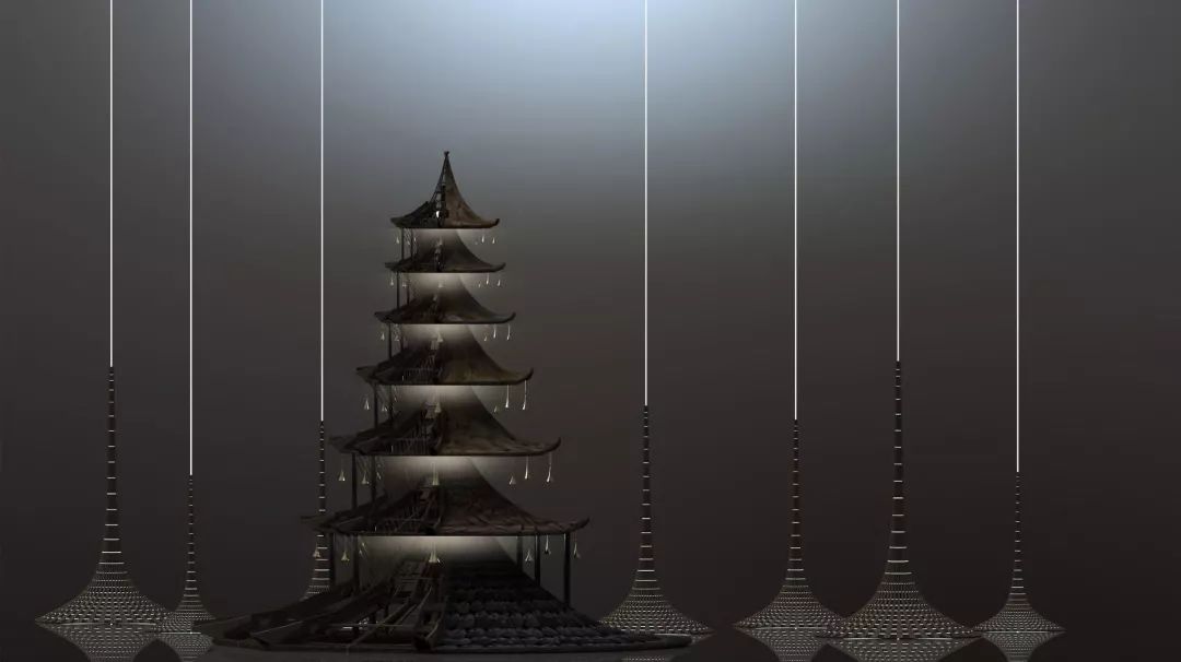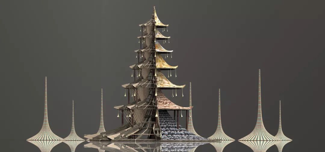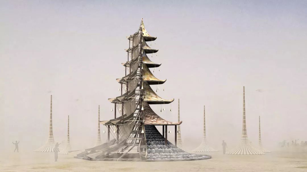 中国古代塔型建筑特征——“斗拱、椽、枋、梁、柱”将被应用在“幻-TULPA ASHRAMS”设计中。许多中国古代和中国现代的生活用品都将作为建筑结构的一部分。其搭配的背景音乐将结合电子音乐与藏传音乐。高塔创意穿越千古,注定为Burning Man而生。
