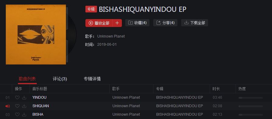 就在2019年6月1日,普及全人类的儿童节,Unknown Planet用一张新EP宣告复出,在各种主流电子音乐甚至商业音乐中创建更多灵活的想法。EP总共包含了三首音乐,分别是《YINDOU》、《SHIQUAN》、《BISHA》,曲风不同,卖点充足。
