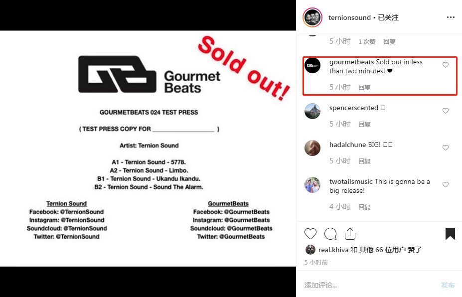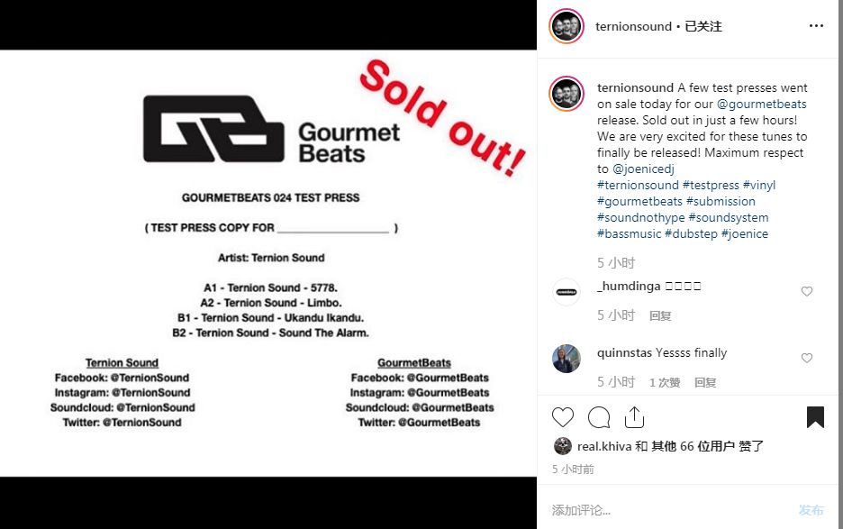 ⒌主要制作Leftfield Bass和Deep Dubstep的美国三人组Ternion Sound在GourmetBeats发布了他们的最新唱片,Ternion Sound很高兴这些唱片在短短的几小时内全数售罄,而GourmetBeats却给出了截然不同的说法——这些唱片在不到两分钟内就全部售罄了。无论怎样,这都是十分惊人的事。