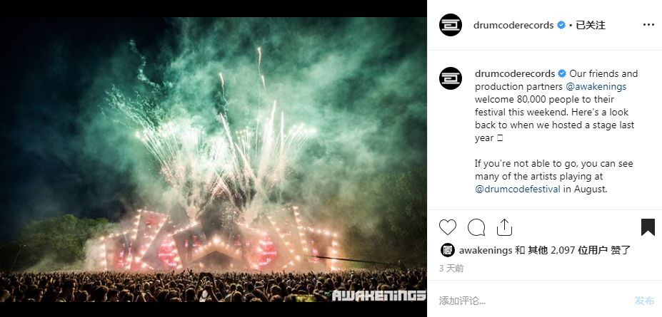 三天前,Awakenings的深度合作对象Drumcode Records为Awakenings进行了活动开始前的最后宣传,也为两家合办的音乐节Drumcode Festival再刷“存在感”。Drumcode直接在活动开始前喊出了8万人的口号,换言之仅限预售票便有此等数据。