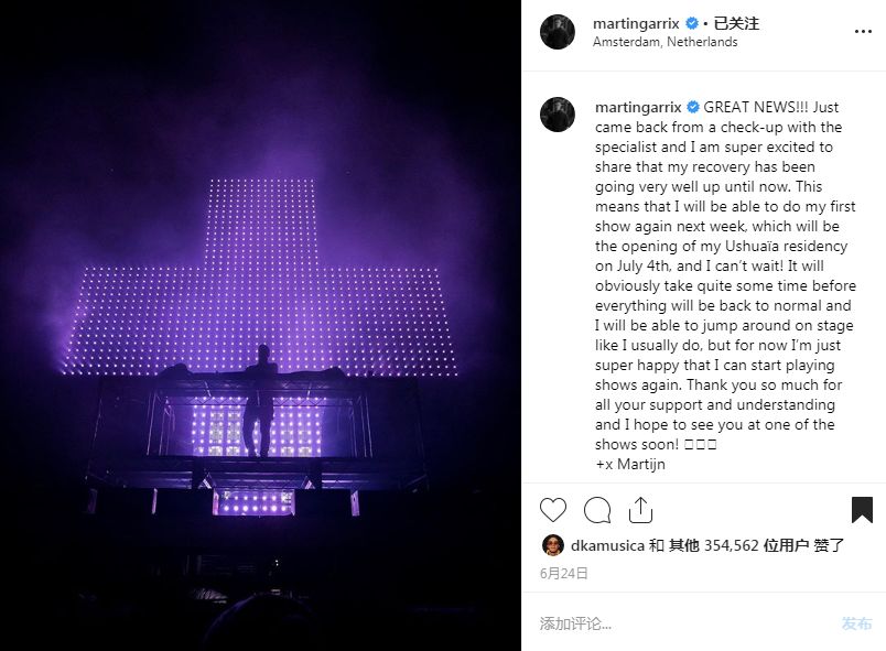 勤奋赚钱的Martin Garrix在公布了“即将恢复,7月4日开始便会重新回到舞台上演出,但是在舞台上“Jump Jump”还需要一段时间。很多粉丝可能会担心Martin Garrix的健康问题,还没彻底恢复就重新开始演出了?然而其实他的演出已经排到十月份了。