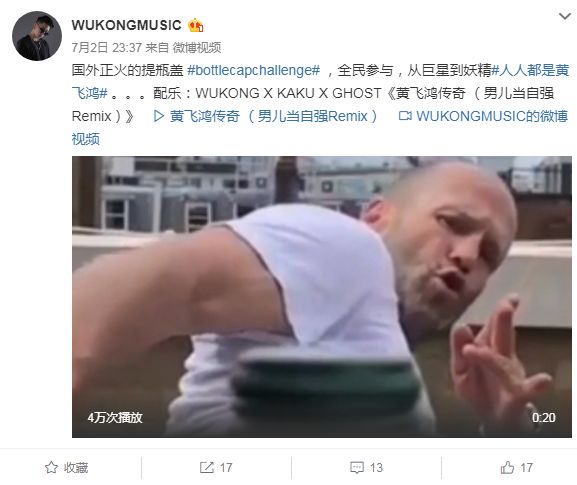 《黄飞鸿传奇》的意义远远胜过那些随意的、未经许可的Bootleg,经过了其原作者家属、版权所属渠道的授权。同时,在近期国际上大红大紫的#bottlecapchallenge话题中,歪果网友们频繁地使用这首音乐作为BGM并编舞,DIMITRI VEGAS & LIKE MIKE也在演出中播放了这首音乐。