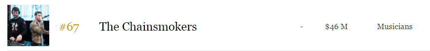 条条大路通罗马,福布斯正在证明成为DJ/制作人也能够年入4600万美金。一年3亿人民币收入,或许是绝大多数读者们可远观而不可亵玩焉的数字,但就在前几天福布斯公布的2019年名人收入排行榜中,就有一个DJ/制作人组合创下了这番记录。