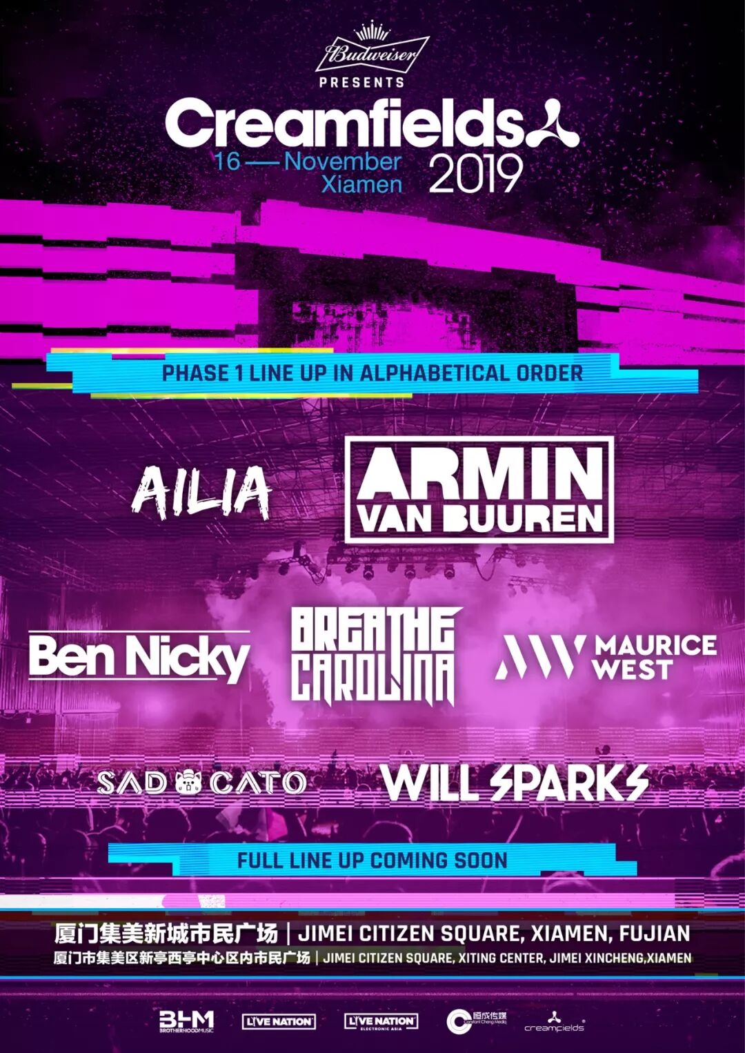 2019年11月16日,英国首屈一指的音乐节品牌Creamfields将再度落户中国福建省厦门市,在集美区新城市民广场举办。周知Creamfields的活动不仅限于户外音乐节,也会有仓库派对。而今年厦门站的Creamfields无疑会是一场大型的户外音乐节,何况去年的Creamfields厦门站无往不利,已官宣的首波阵容如下。