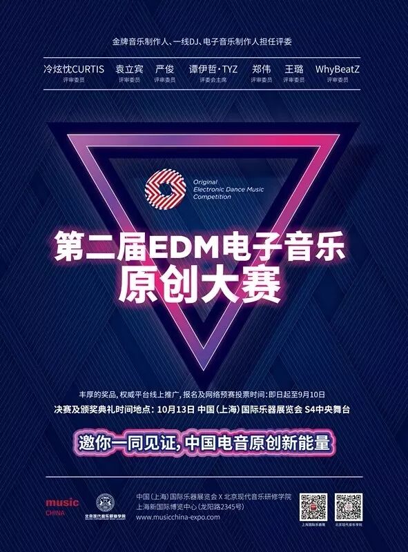 《第二届EDM/电子音乐原创大赛》由北京现代音乐研修学院和中国(上海)国际乐器展览会组委会两大组织联合举办,晃眼今日,该比赛的报名似乎也已经进入了尾声。线上报名渠道将于2019年9月10日关闭,尚未投稿的你,勿轻易错过最后一百米的冲刺赛道。