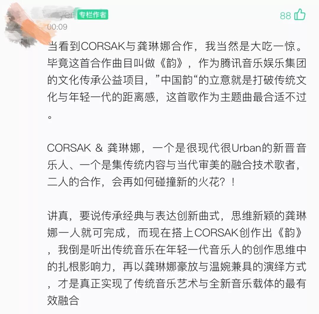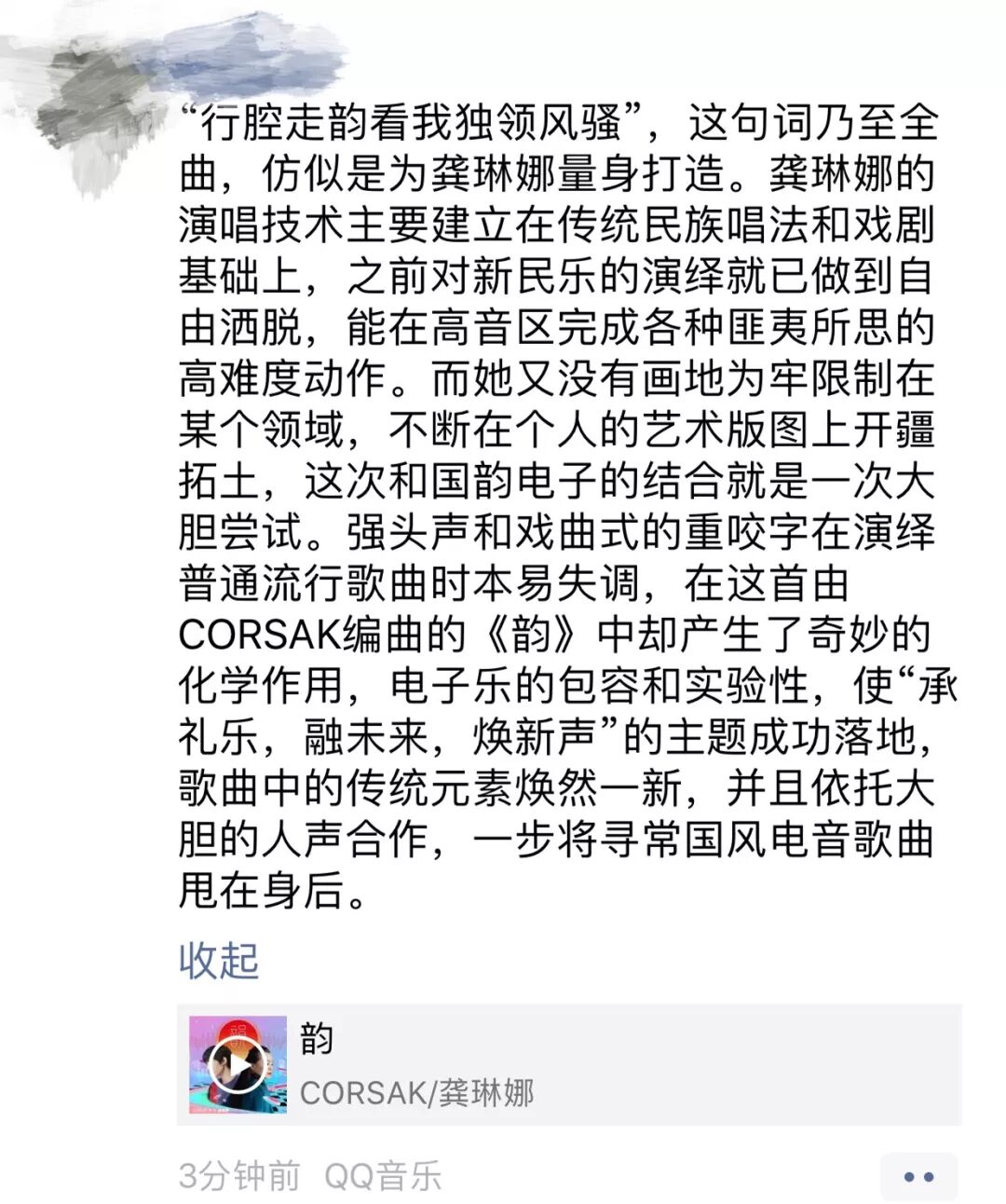 新动作!今天凌晨,国家队级别音乐人、“中国新艺术音乐”创始人龚琳娜与近年大热、单曲全网播放量达10亿的中国电子音乐新秀CORSAK合作的新单曲《韵》,在腾讯音乐集团旗下QQ音乐、酷狗音乐、酷我音乐上线,这是一首将中国民乐与Future Bass/Melodic Trap结合的国风电音新单。