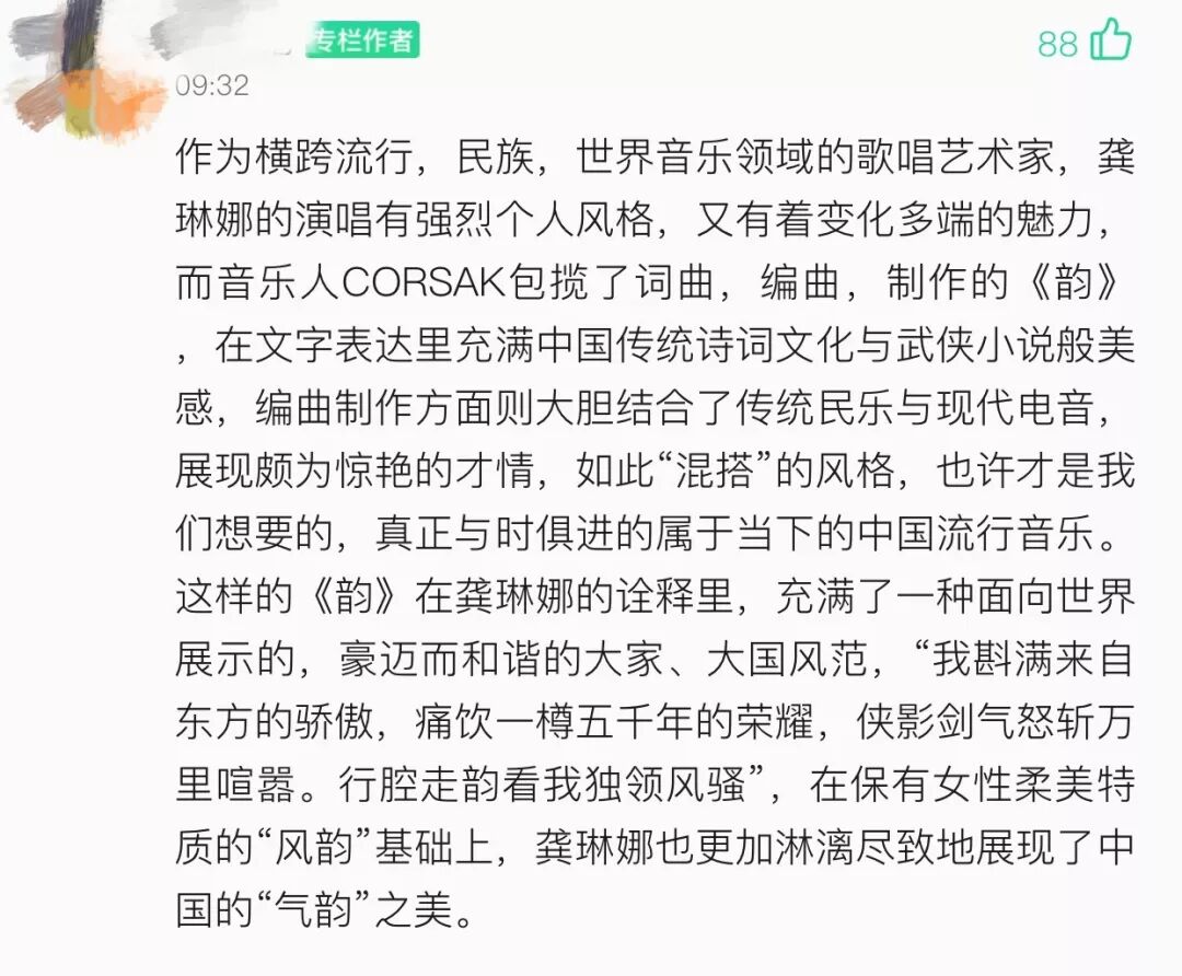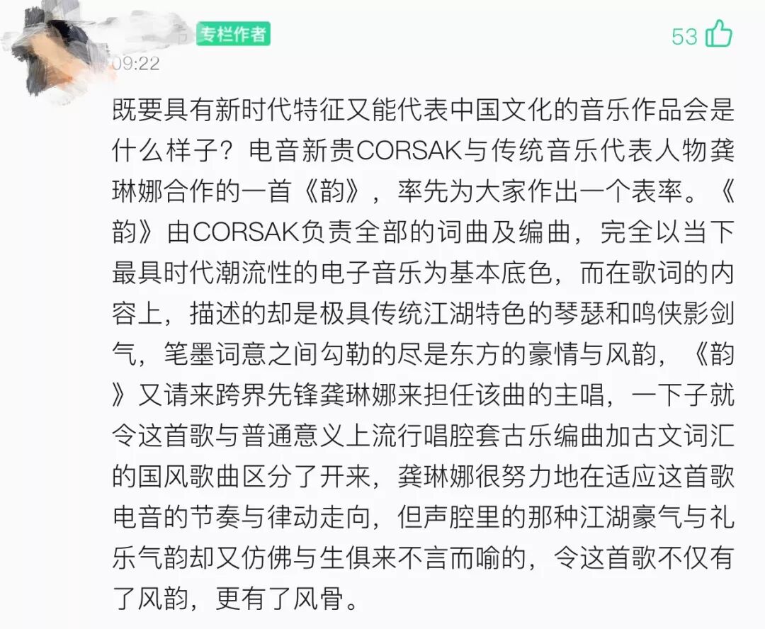 《韵》以五声音阶宫商角徵羽为灵感,融合了山海经中的元素,以电音的形式打造出一种纵横江湖的武侠风,一经上线,就成功吸引了各界目光,收获微博乐评人和歌迷的热烈反响。流媒体及社交网络上的网友纷纷指出龚琳娜在国风方面发挥出了不时常但史无前例的本领,再塑新民乐前沿,而CORSAK的制作及电子色彩与国风配合巧妙,一加一大于二。