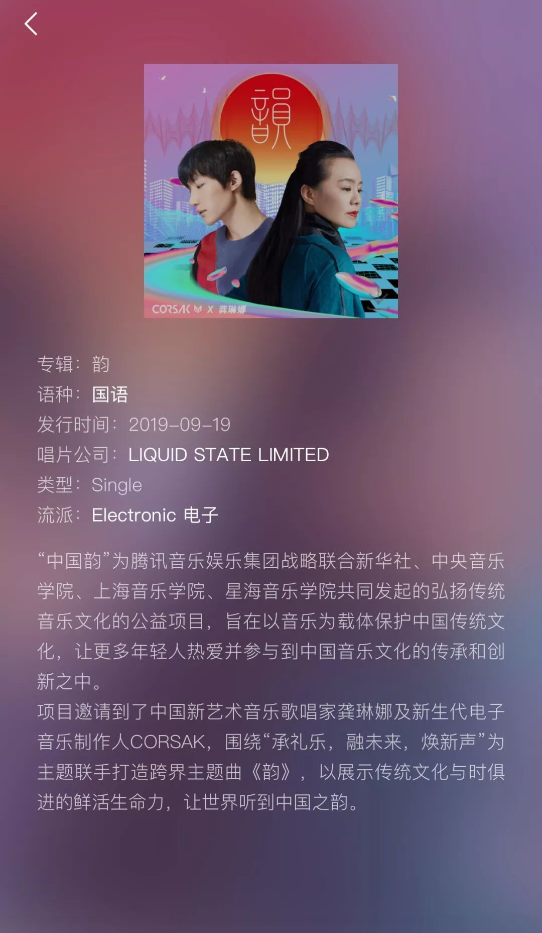 《韵》是腾讯音乐主办的原创音乐征集项目“中国韵”的主题曲,龚琳娜和CORSAK作为该项目的官方召集人,秉承“承礼乐,融未来,焕新声”的理念,共同打造了这首全新国风电音神曲,也是为有意愿参加中国韵征集的音乐人提供一个范本。