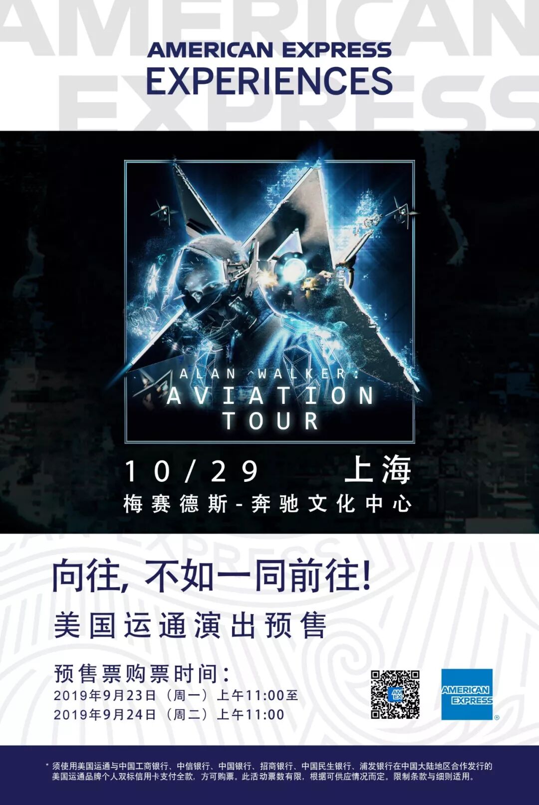 就在9月23日11:00至9月24日11:00,美国运通和Live Nation将同时开启“Aviation Tour”上海站的超前预售,美国运通卡会员可点击阅读原文优先购买上海站预售票。Live Nation的微信官方公众号也将开启购票特权。另外,成都站和佛山站门票正在火热预售中。