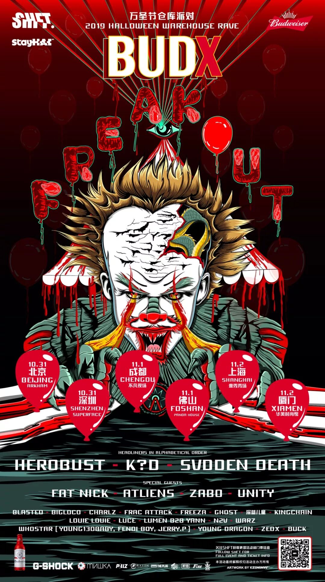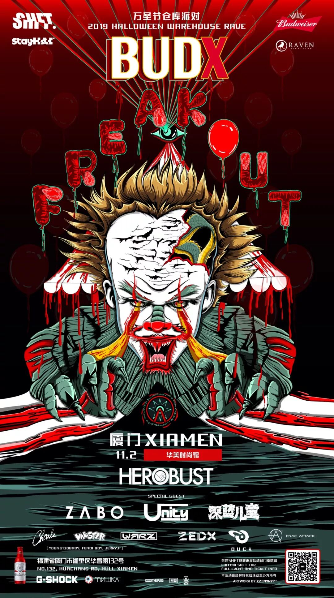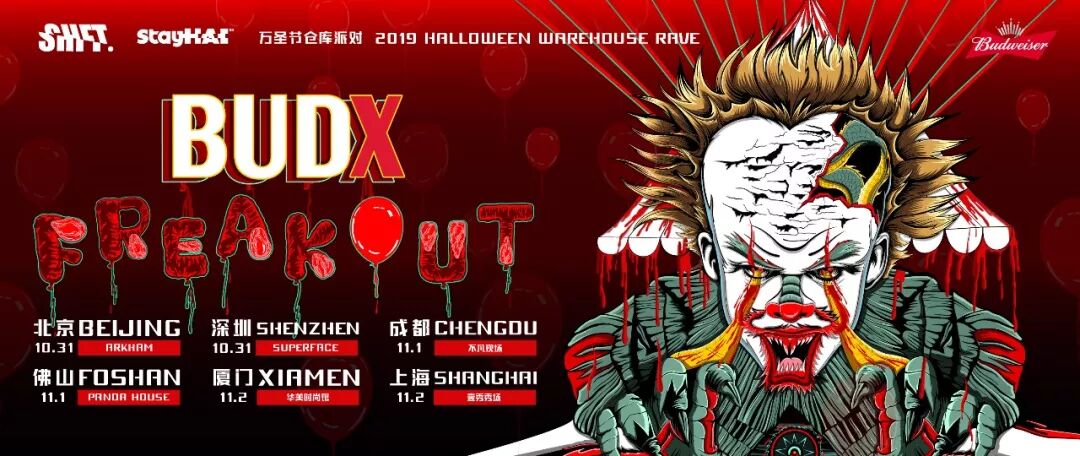 “邪恶马戏团”在近期公布了他们的“劫持名单”,小丑更是光明正大地公布了他接下来的狂欢地点,这次他与他的兄弟们打算玩场更大的。更疯狂的尖叫声,更惊悚的场地布置,更出乎意料的万圣节文化连接口,但又保持着一如既往的招牌——BUDX FREAK OUT。