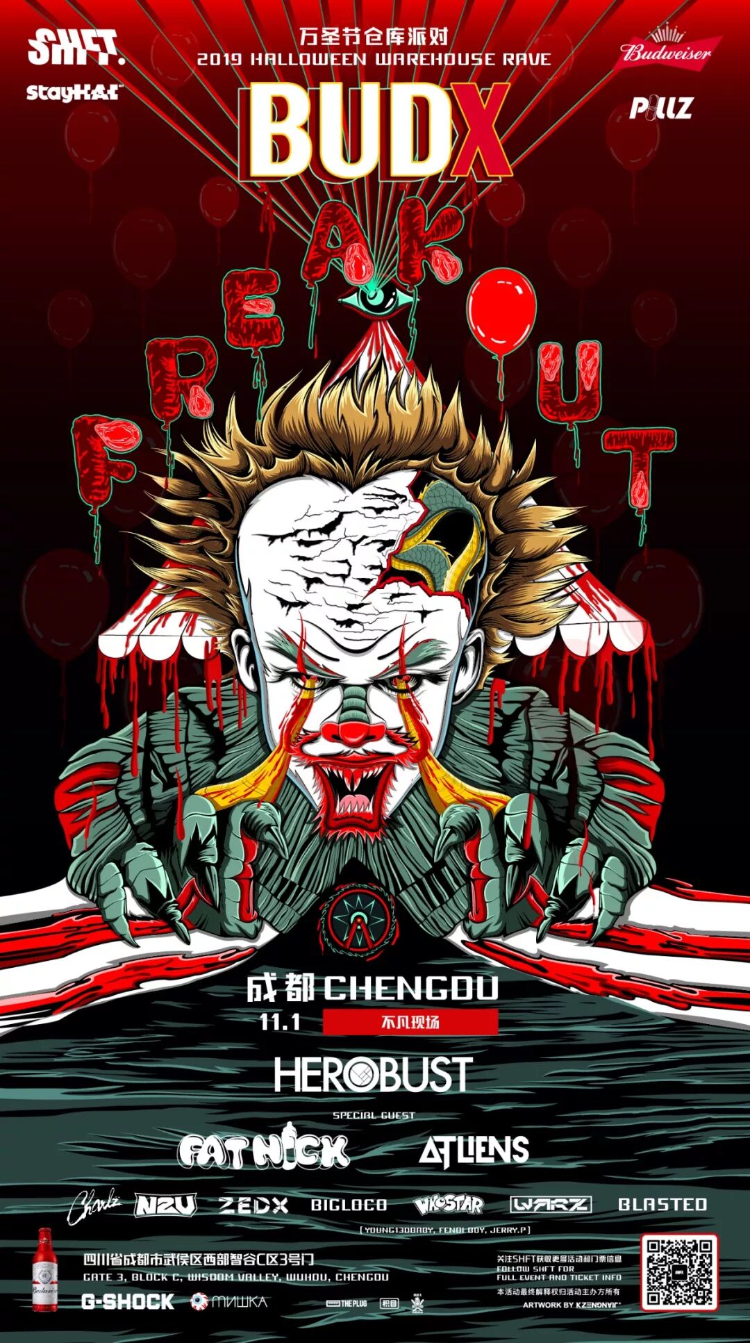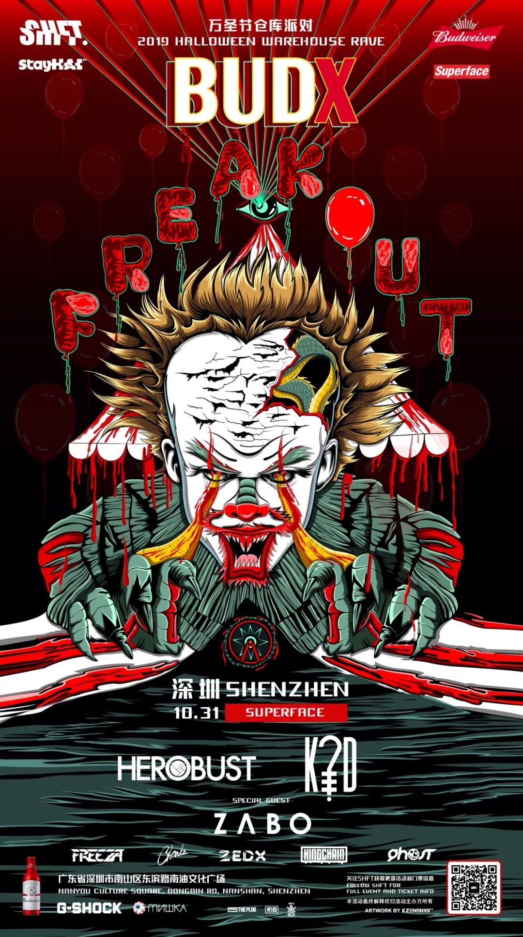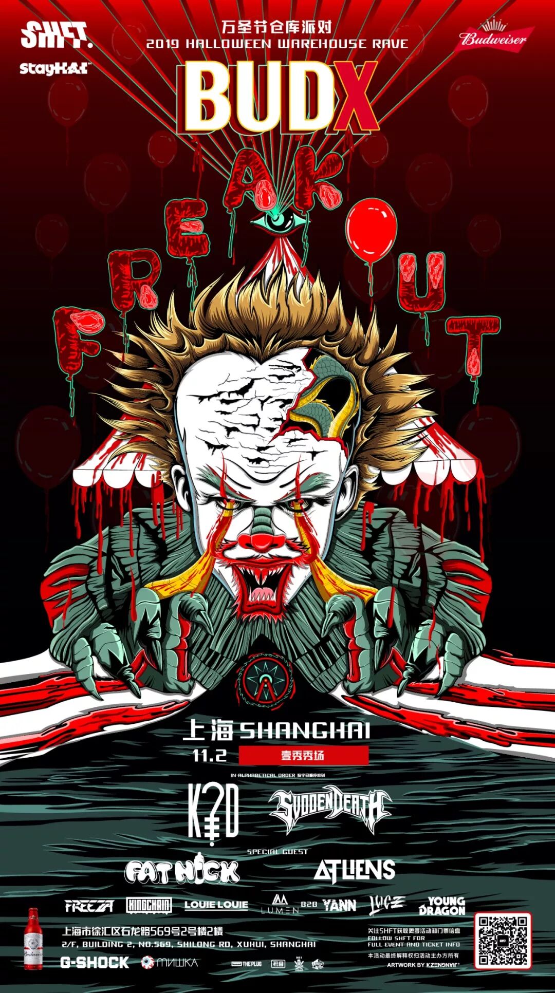 “邪恶马戏团”在近期公布了他们的“劫持名单”,小丑更是光明正大地公布了他接下来的狂欢地点,这次他与他的兄弟们打算玩场更大的。更疯狂的尖叫声,更惊悚的场地布置,更出乎意料的万圣节文化连接口,但又保持着一如既往的招牌——BUDX FREAK OUT。