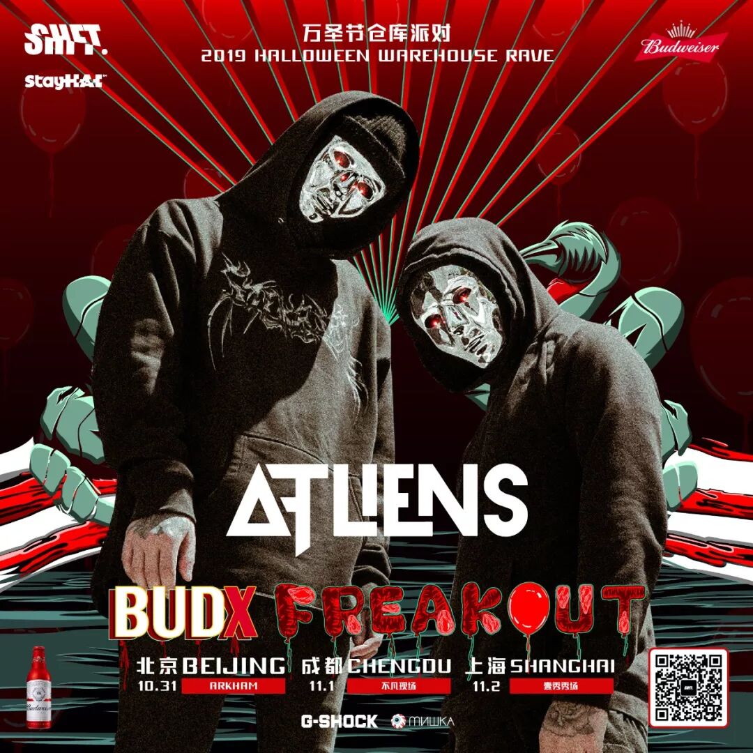 Atliens:神秘的双人组总是佩戴着双眼红光的诡异颜色面具,以其频繁出现的金属字和金属文化印花的服装示人,用现代Bass Music传播着他们的黑暗艺术。Leftfield Bass/Deep Dubstep/Hybrid Trap/Heavy Dubstep/Riddim Dubstep都可能成为他们的现场内容。