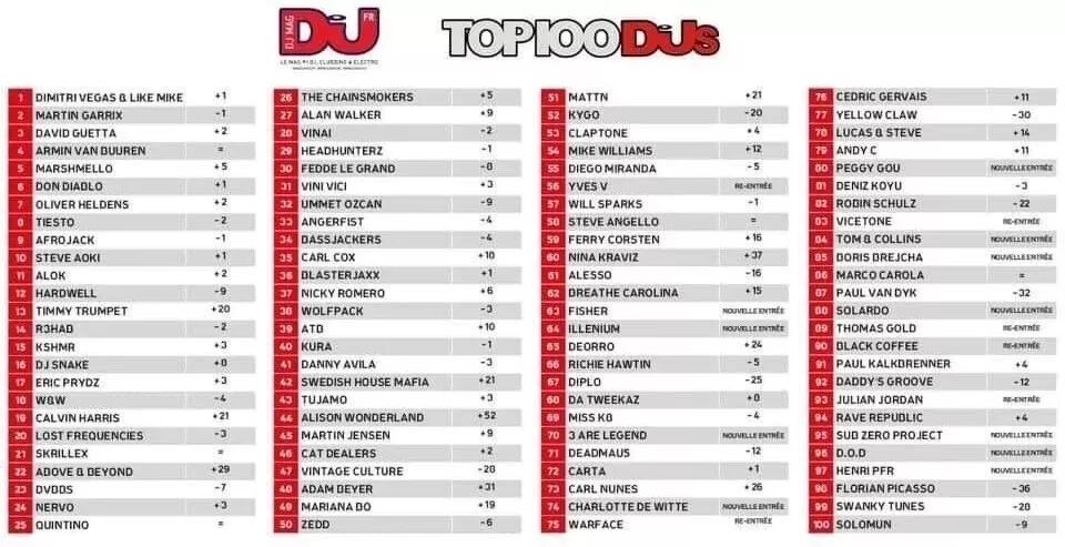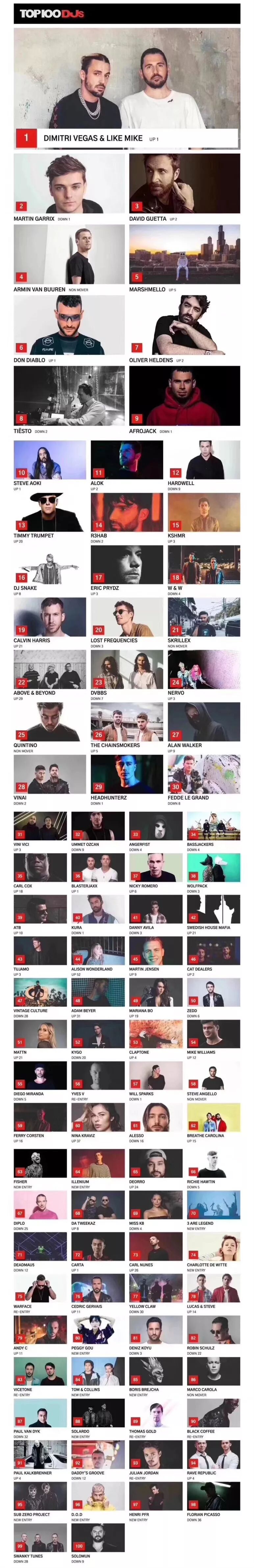 佚名:精细数了一下,这榜单里我喜欢的DJ/制作人一共加起来不超过10位,而且无论是喜欢他们DJ Set的现场或者是制作的音乐都屈指可数。整体实力实在太低了,萌新排行榜。