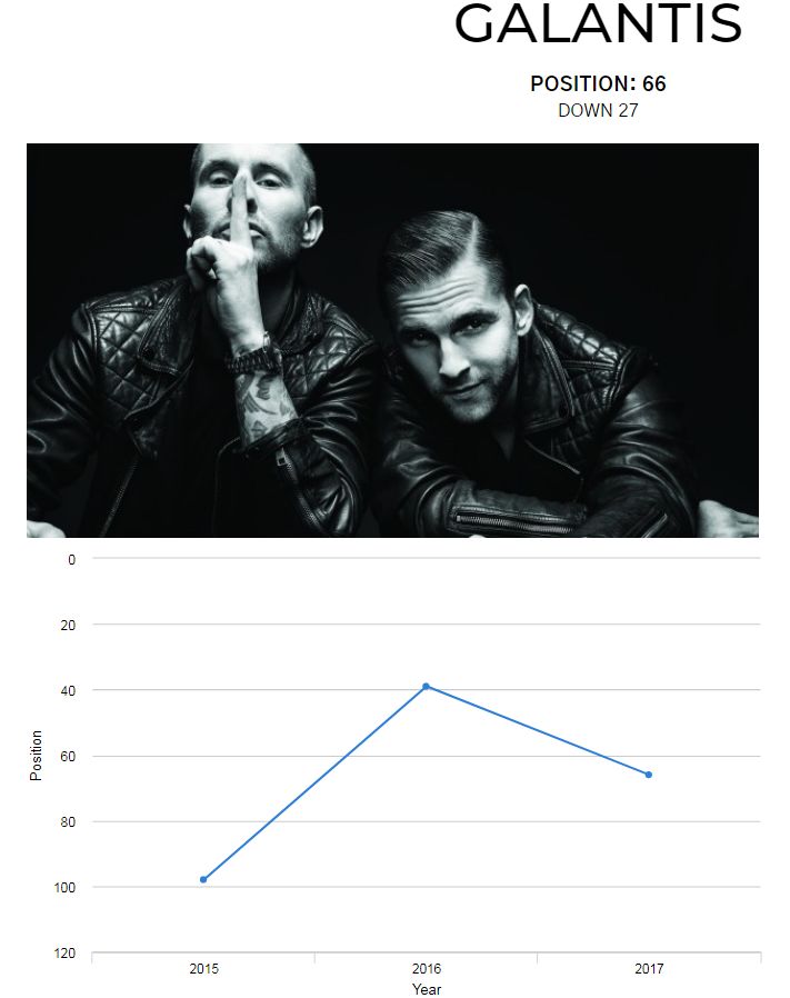 之余,Galantis更是两次获得格莱美提名(注明:一次是Galantis名下的音乐,一次是为他人制作的音乐),或是在声名狼藉的DJ Mag百大DJ排行榜上取得过三次成绩,至于为什么后来跳出了排行榜,你知我知天知地知。