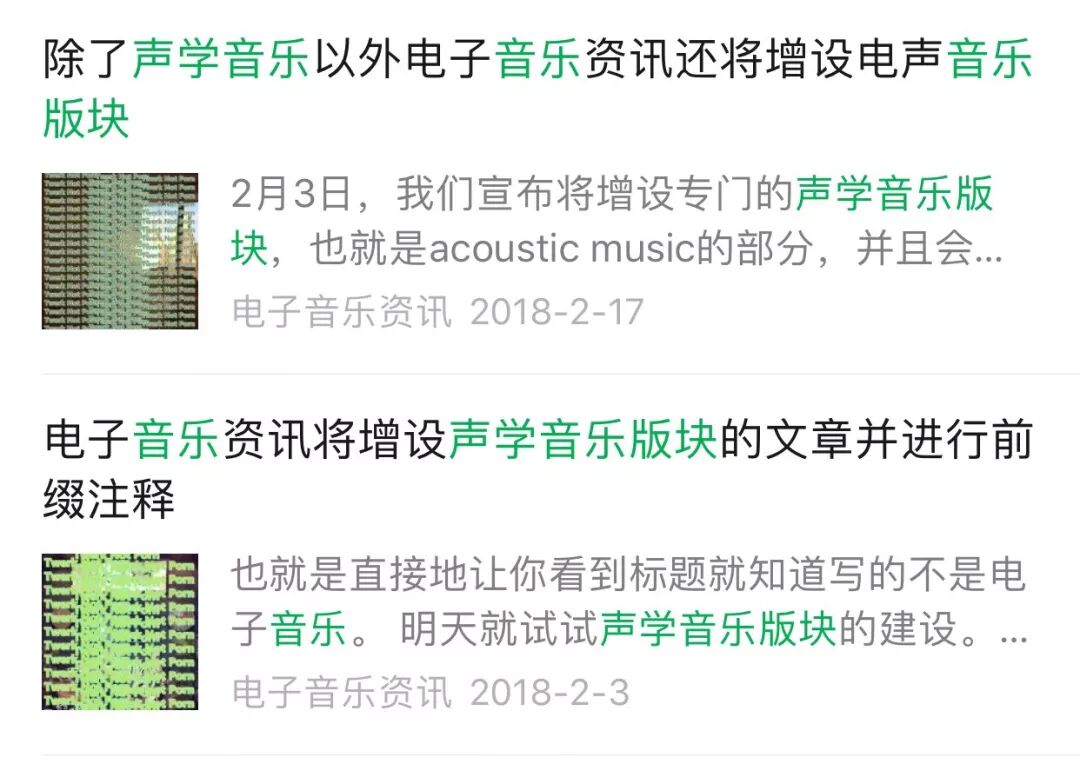 带有Acoustic的声学音乐版块和带有Electroacoustic的电声音乐版块,分别自2018年2月3日和2018年2月17日随次条文章作为公告于《电子音乐资讯》启动,从此一发不可收拾。你可以在历史消息中搜索Acoustic和Electroacoustic了解更多相关版块的话题。