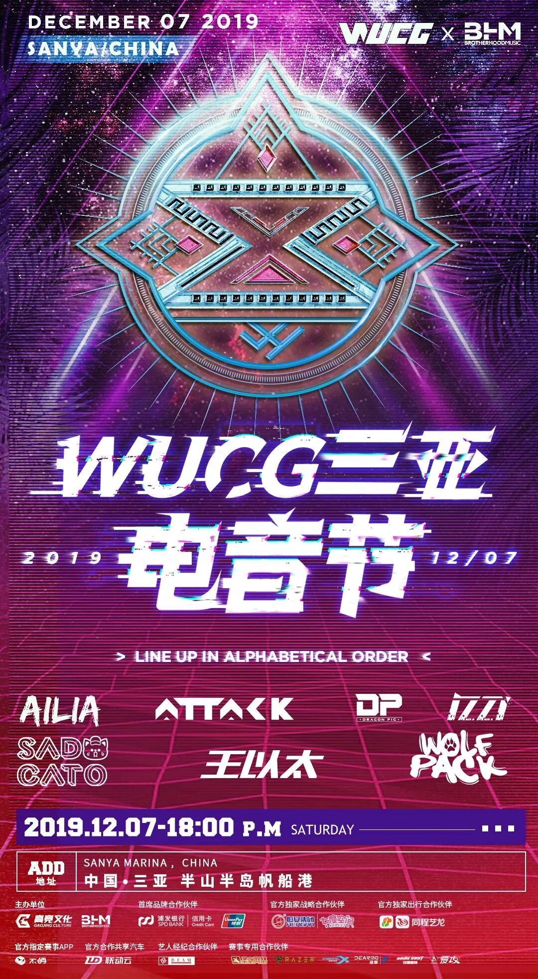 就在昨天,这个续大量国际上的电竞与电音合作的成功案例后全新的项目,宣布了他们的完整阵容,且宣布了在DJ表演之余,届时又含20多个国家的高校电竞队伍到场参加WUCG 2019全球总决赛,活动共包含四日的电竞赛以及一日的电音活动。已知的阵容如下。Wolfpack:2011年,来自比利时的Steve Braet和Ruben Khaza组成了一个名为Wolfpack的组合。一直以来,他们是Dimitri Vegas & Like Mike创立的厂牌Smash the House的签约艺人并最大力度推广和包装的名字,该组合与他们的老板有着极高相似度。王以太:从综艺节目《中国新说唱》走出来的高名次Rapper,在当今的中国Hip-Hop Music/Rap Music市场中有很高人气。