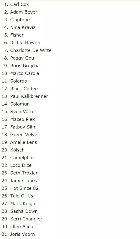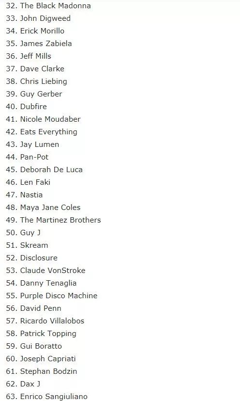 图片来自DJ Mag所谓的真与假只是投票方面是真是假,并不包含其它真伪。还是那句话:你有权支持或反对任何一张榜单,但我们也有权对名次买卖与否的两张榜单进行比较。不过倘若这两张榜单内的任何一张榜单对你有帮助,不要以消极或负面的情绪看待它们,它们只是列表而已。