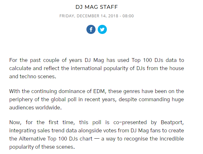 你可以从推文的时间考证该榜单于北京时间2018年11月30日全球揭晓,但一直到2018年12月14日,DJ Mag官方才对外宣布这张榜单的性质。该榜单由DJ Mag官网投票及Beatport数字唱片销量共同决定结果,专注于House和Techno艺人。