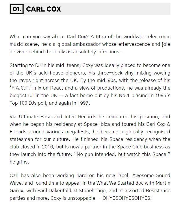 连任冠军的Carl Cox无数次取得Techno及House最佳制作人或者最佳DJ的奖项,在不限于DJ Mag的平台上。不过DJ Mag的笔者可能有些偷懒,今年所使用的文案几乎照搬了自己去年的文案——包括榜单由投票和销量决定、与EDM的区别化、截然不同的结果。