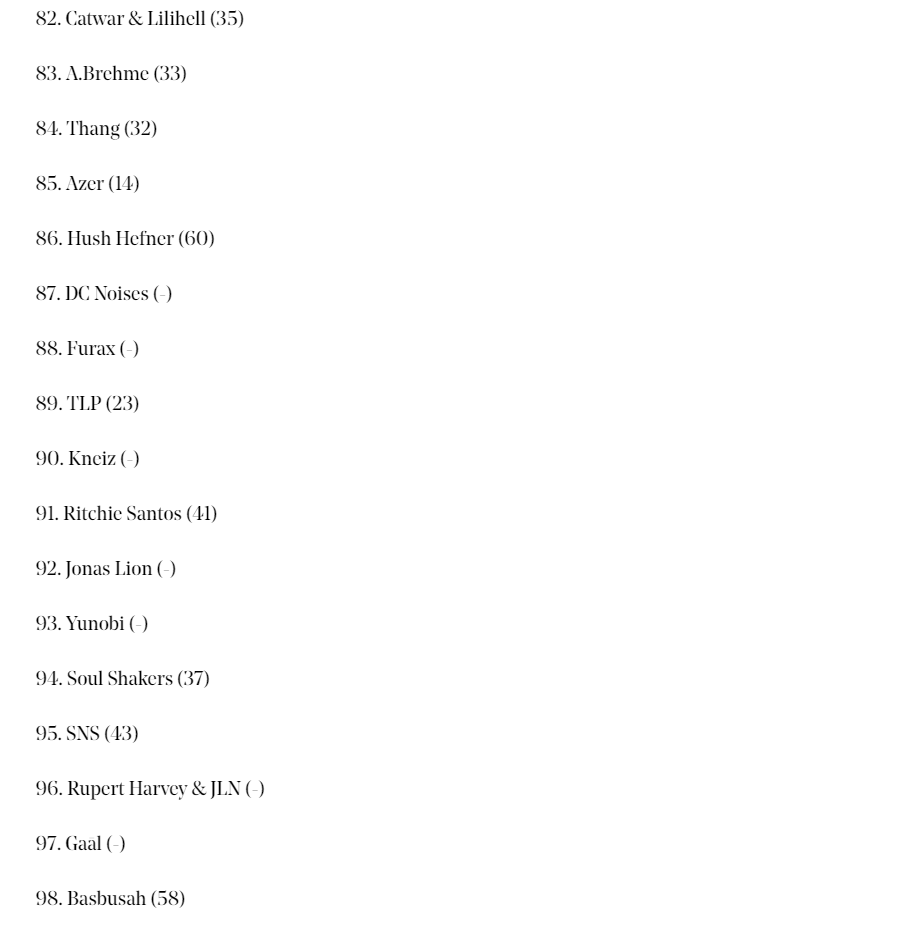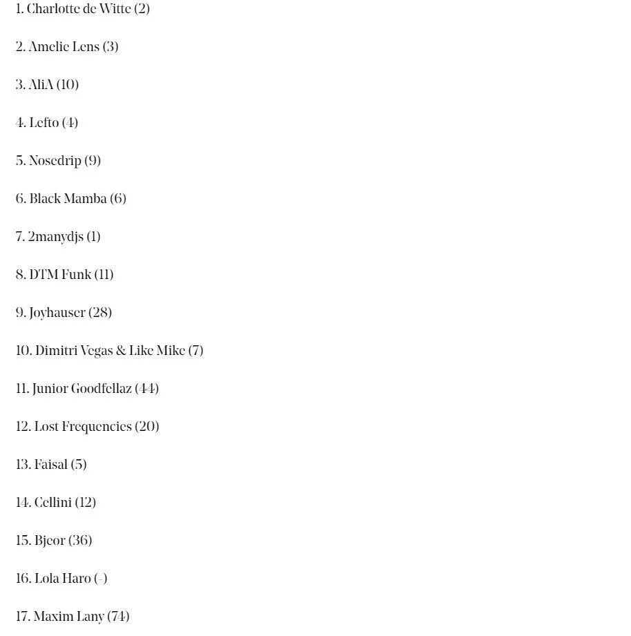 值得一提的是,括号内的数字为去年的成绩,所以大家可以发现红牛的这份比利时百大DJ排行榜与去年的情况有何不同。为节约篇幅,压缩“过长文章”,提升阅读体验,笔者不在此展开对比2018年和2019年的情况,除非大量读者们提出分析需求。