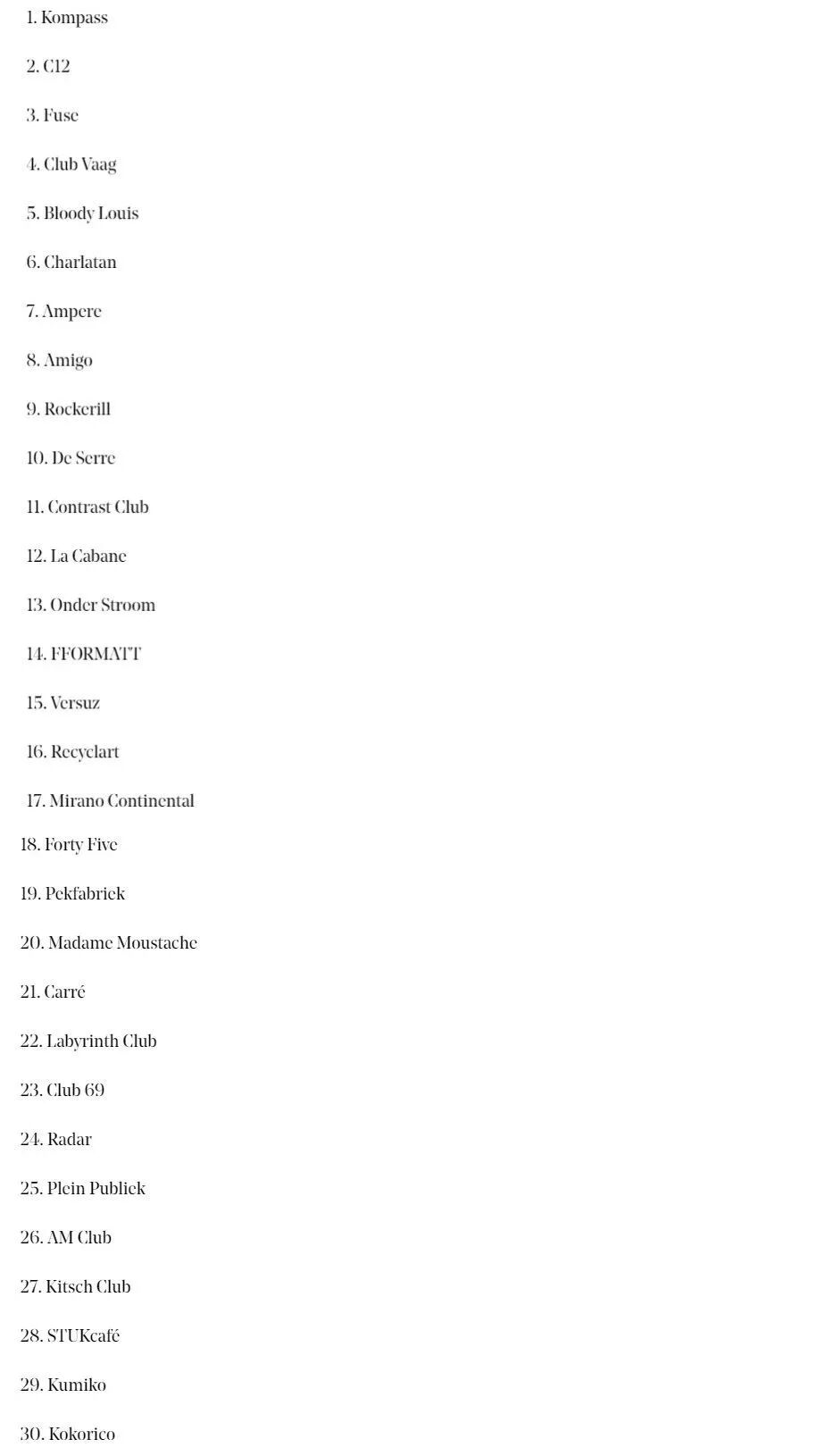 按照Red Bull Elektropedia官网顺序,我们先来揭晓本次红牛旗下的比利时30大夜店排行榜结果,这些夜店极有可能在未来或现在成为你的比利时旅程的选择项。比利时30大夜店排行榜的结果由27000位粉丝投票以及数十名评委共同得出,以下为官网列表。