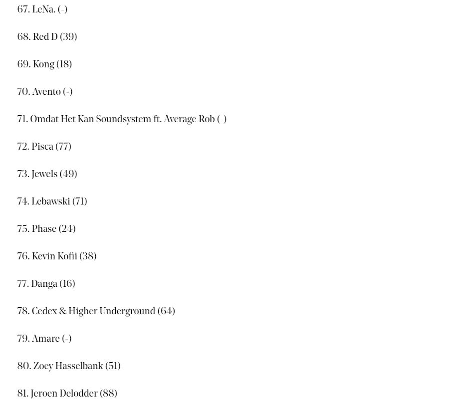 后为Red Bull Elektropedia比利时百大DJ排行榜,同样由2.7万投票的粉丝以及数十名评委共同得出结果,全球最火的几个Techno女明星之一Charlotte de Witte和头衔相同的Amelie Lens以及其它令人熟知的名字纷纷上榜。比利时电子音乐市场谜底被揭晓。