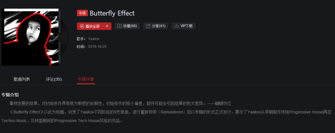 Yaakov就这么做了。Yaakov不仅是目前为止在网易云音乐上粉丝数最多的Techno中国艺人,他也是电子音乐资讯旗下艺人团队DarkGlow的签约艺人。就在2019年10月25日,Yaakov发布了他的首张重母带专辑《Butterfly Effect》,包括九首重母带的曲目。