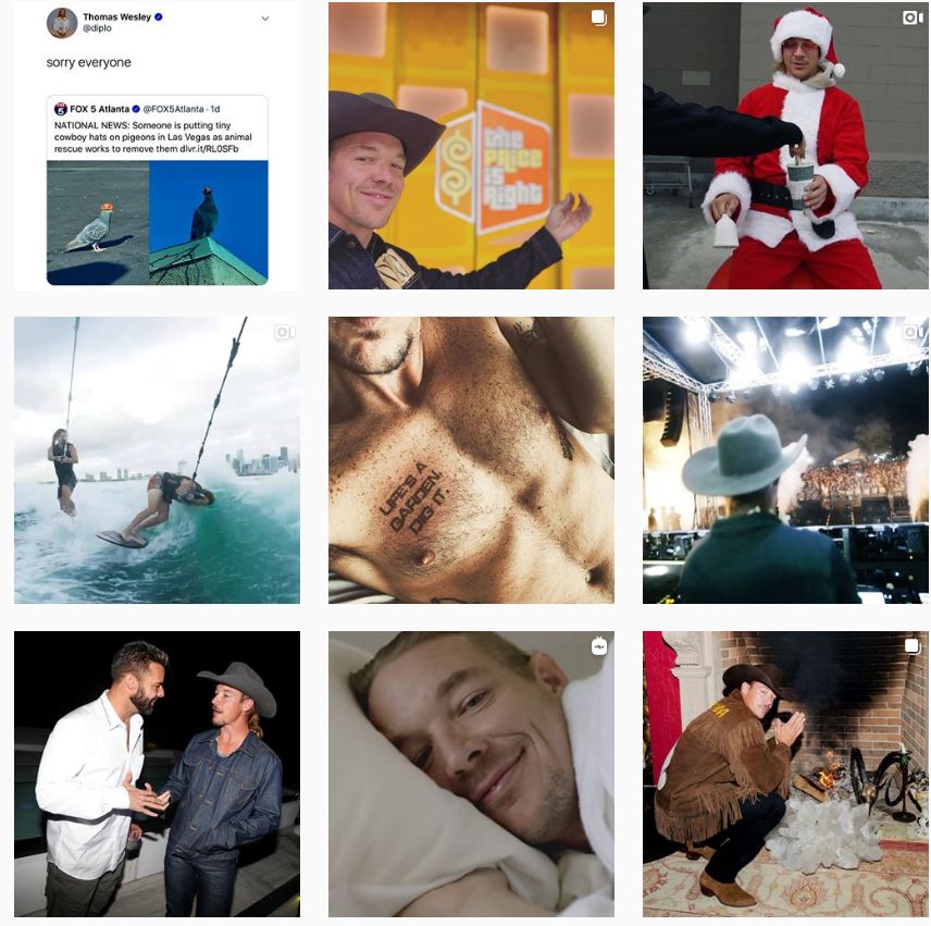 在音乐艺人领域,也有不少人把自己叫作Instagram Model,通常是戏称。以DJ/制作人为例子,众所周知的大明星Diplo就长期自嘲自己只是一名Instagram Model而已。除了演出视频和照片外,他总是频繁地输出着日常生活中的照片与视频。