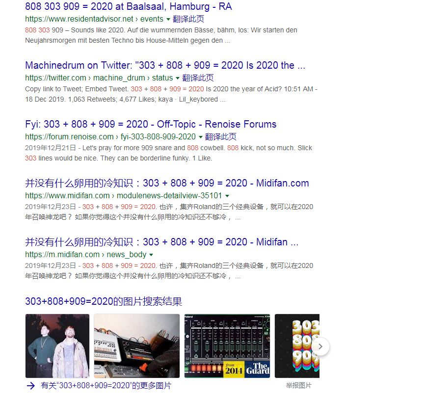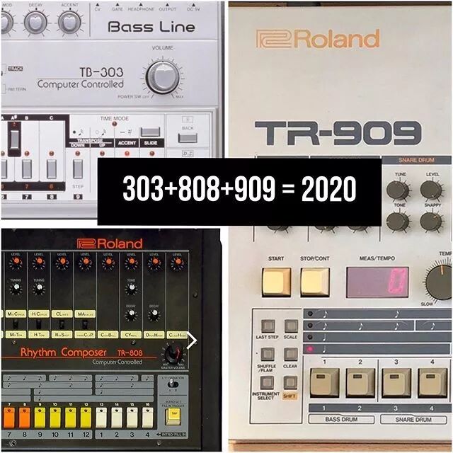 好的,那么到底什么是“303+808+909=2020”?为什么人们认为命运像“魔咒”一般驱使它征服整个2020年?首先,这是一道字面数学题,字面到303和808再与909相加后的确等于2020。再者,303和808及909均为电子音乐中的传奇印记,三大标志长期被捆绑着。解构部分之303:303在音乐领域通常是罗兰TB-303的简便化缩写,而Roland TB-303是一款诞生于1981年但在1984年停产的Bassline Synthesizer,它以合成器声音的方式模拟贝斯吉他并进行更电子化地处理。尽管在商业上并没有取得成功,但那些绝版的二手303至今十分抢手。