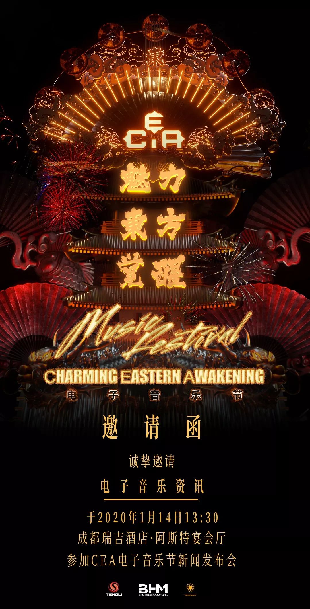 2020年1月14日,即《电子音乐资讯》发文当天,CEA Festival新闻发布会在成都瑞吉酒店如期展开。主办方兄弟时光与成都市武侯区文旅产业达成合作,为积极推动锐舞及东方传统文化献力,CEA魅力东方觉醒音乐节更是在发布会上立下打破国内电音节最大规模的目标,尽力在未来让中国品牌>外国品牌成为可能。