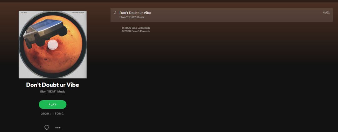 图片来自G**gle Images 图片版权属于原主在化身为电音艺人以前和化身说唱艺人之余,Elon Musk还时不时从企业家跨度成一名Meme主持人。实际上,在最新单曲《Don't Doubt ur Vibe》中,Elon Musk也留下了一个有趣的Meme——他在Spotify上使用了一个名为Elon “EDM” Musk的名字。