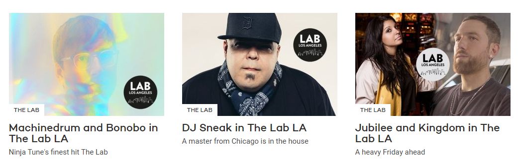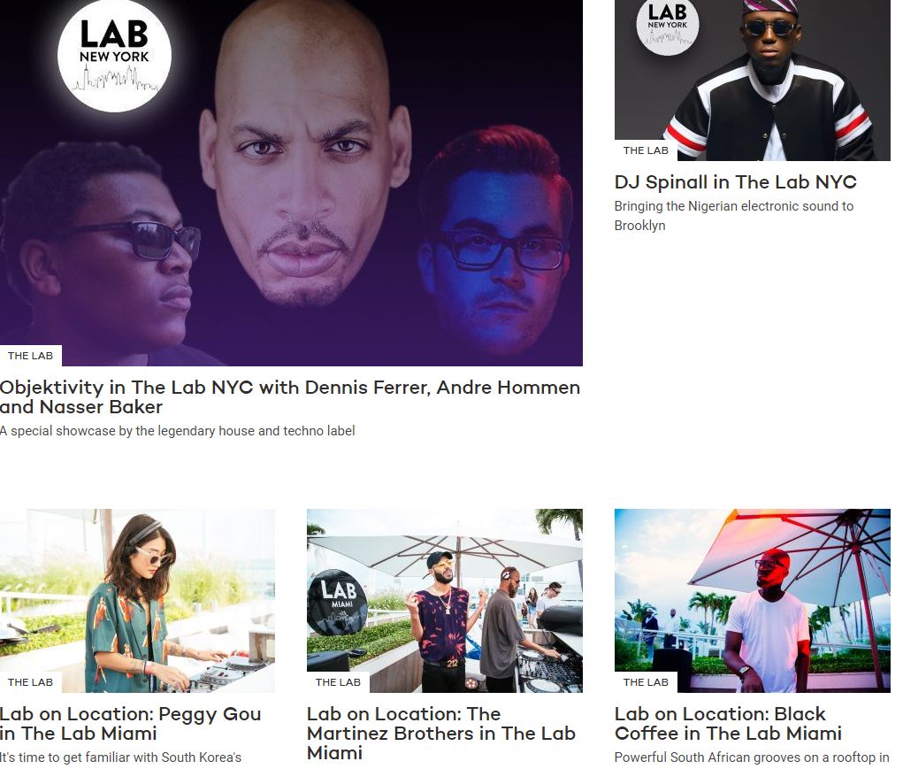 ④Mixmag The Lab:全球三大电子音乐媒体之一Mixmag旗下的直播品牌,在伦敦、底特律、纽约、迈阿密、悉尼、洛杉矶等地球派对圣地建立拍摄点,向世界带来不同的、常被列入地下但在欧洲十分主流的跳舞音乐声音。多数时候直接称作The Lab,可忽略前后缀。