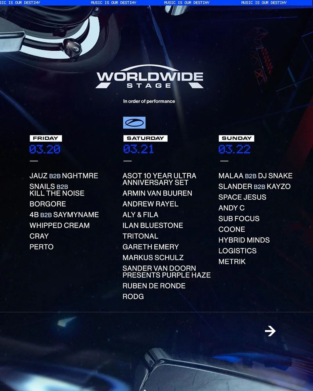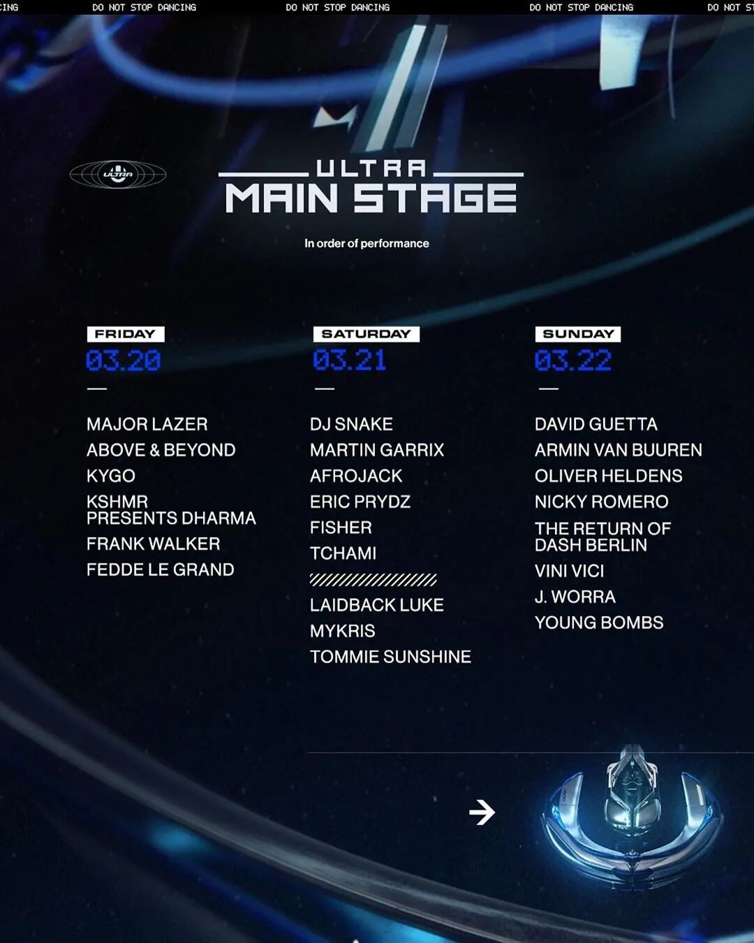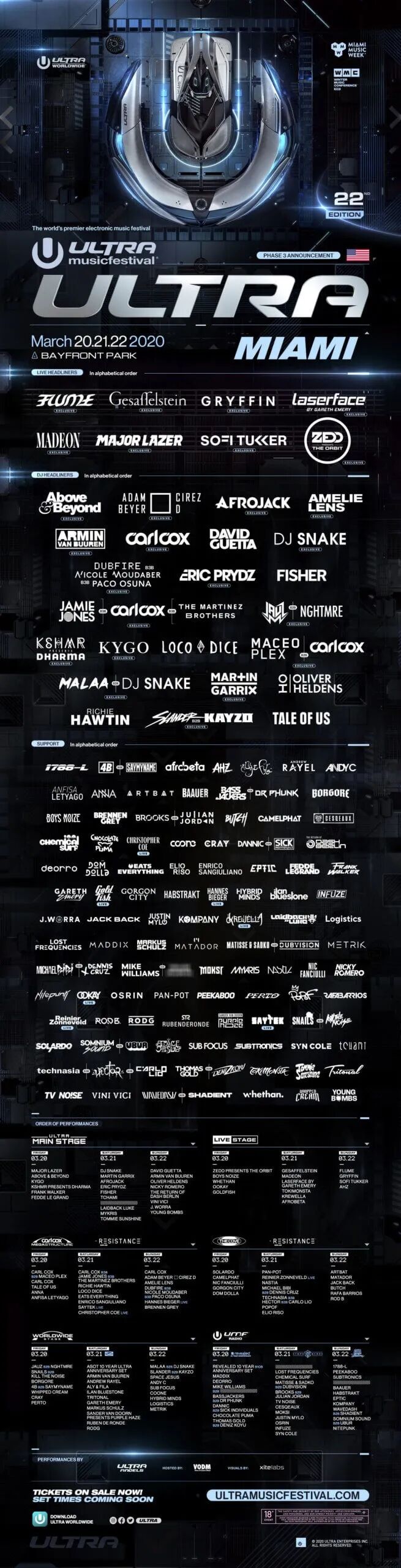 昨日,Ultra Music Festival宣布的第三波阵容总共涉及主舞台、Live舞台、Worldwide舞台、Carl Cox Megastructure (电阻衍生项目)、The Cove (电阻衍生项目)、UMF Radio(含Revealed舞台、STMPD舞台、GUD VIBRATIONS舞台)。
