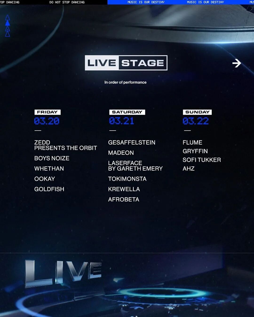 Revealed Recordings十周年Set在UMF Radio舞台整了个所谓的“B10B”算是一大猎奇亮点,即10名DJ将在UMF Radio首日共同在舞台上B2B。其它舞台和时间段的B2B和B3B也很有趣,对于追求新鲜感的Ravers值得尝试,更不乏某些平时少以Live Set出现的Live Set。